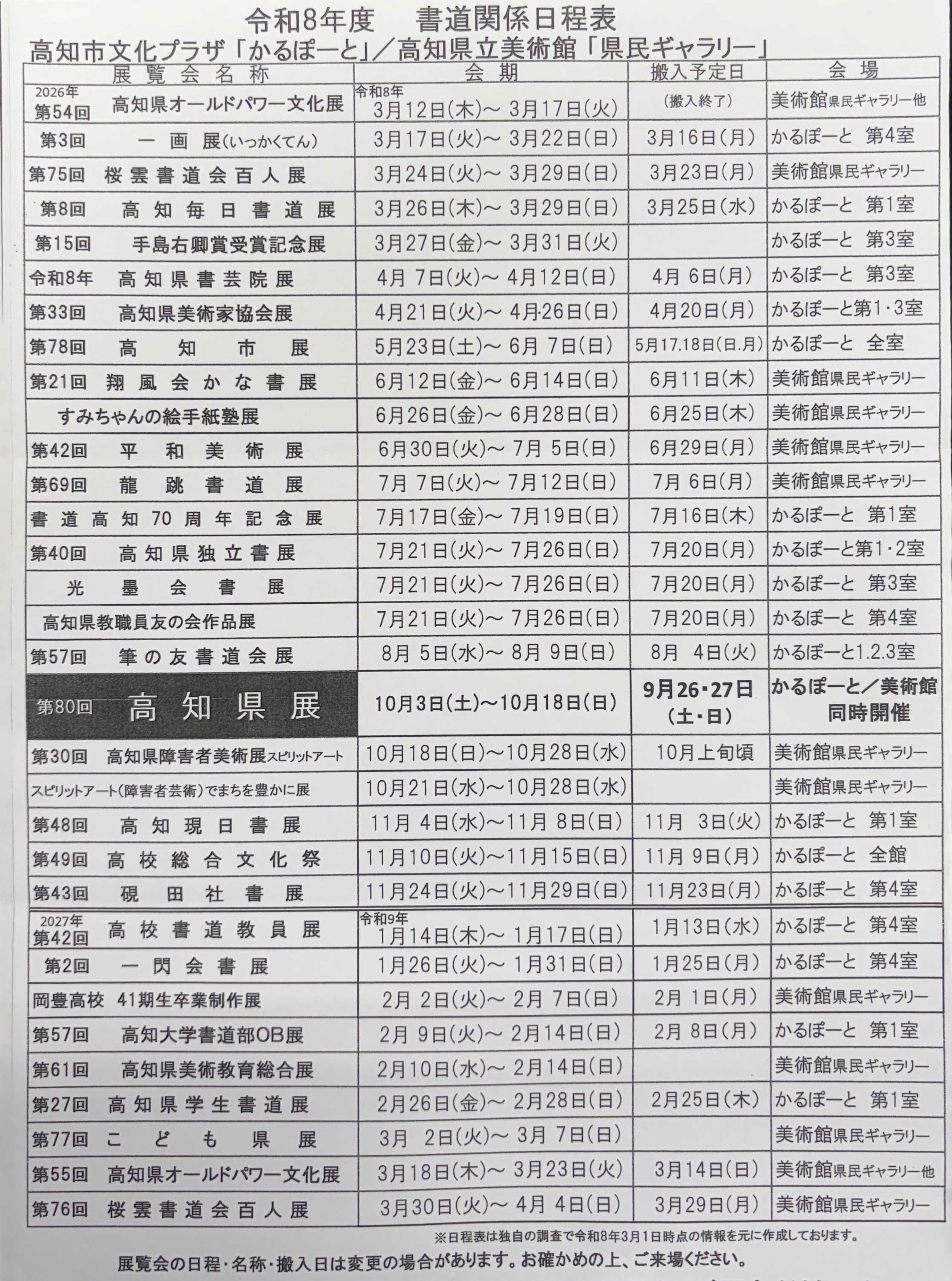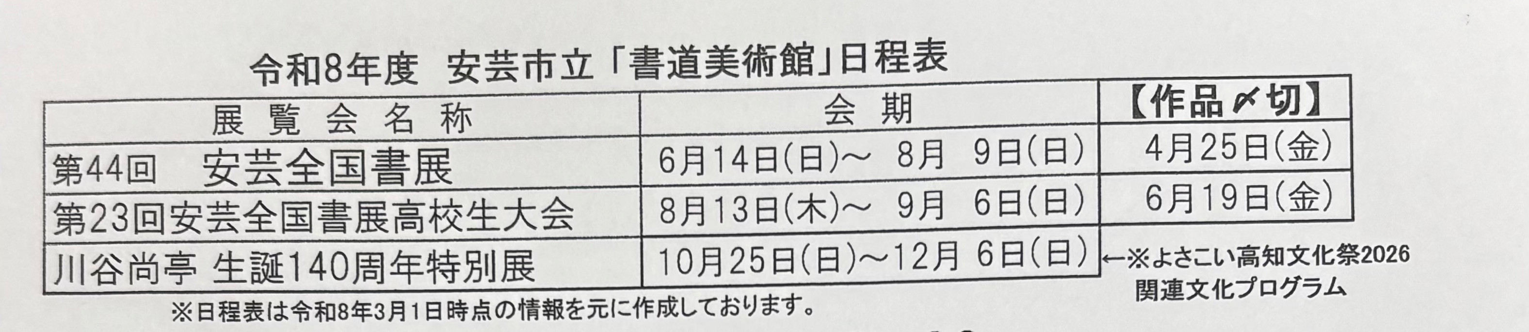 | 令和8度 高知市文化プラザ 「かるぽーと」 ・ 高知県立美術館 「県民ギャラリー」 安芸市立 書道美術館 書道関係日程表 |